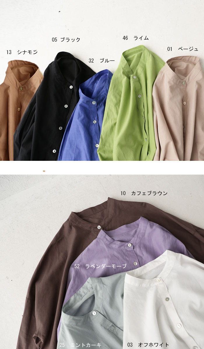 [シャツ ブラウス レディース 長袖] オーガニックコットン100% バンドカラー シャツ / 日本製 メール便可 40代 50代 60代 30代女性 ファッション コットン 綿100 ノーカラー スタンドカラー オックス素材 母の日ギフト